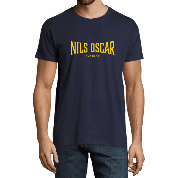 Vit t-shirt med svart Nils Oscar logo i 100% bomull. Finns i olika färger och i storlekarna XS-XXXL